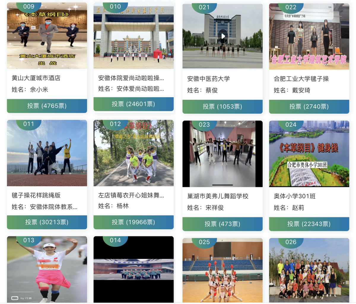 本次《本草纲目》毽子操争霸赛不限年龄、不限男女,零门槛参赛。有来自高校的街舞团、啦啦队、体校的运动队、老年大学的舞蹈队、小学的美少女、中学的青年突击队等各参赛队表演各具特色,精彩纷呈。在肥高校大学生健身接龙赛和全民燃脂接力赛的陆续开展,更是进一步“拉满”云健身的运动氛围,将赛事推向高潮。